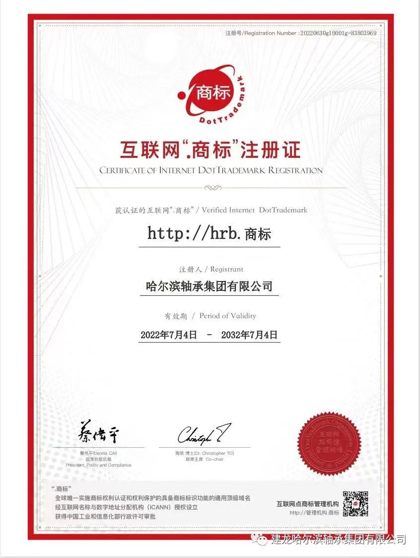 祝賀哈爾濱軸承集團(tuán)有限公司喜獲互聯(lián)網(wǎng)“商標(biāo)”注冊證