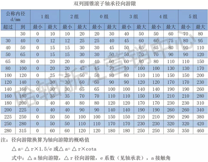 單列圓錐滾子軸承制造安裝后才有內(nèi)部游隙,并在另一個(gè)以相反方向定位的軸承進(jìn)行調(diào)節(jié)后才能確定。雙列圓錐滾子軸承徑向游隙按下表執(zhí)行。